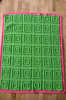 Finish #3. Custom crocheted blanket. A woman's granddaughter requested my pattern but made with Granny Apple green and a hot pink border. I hope she likes it.