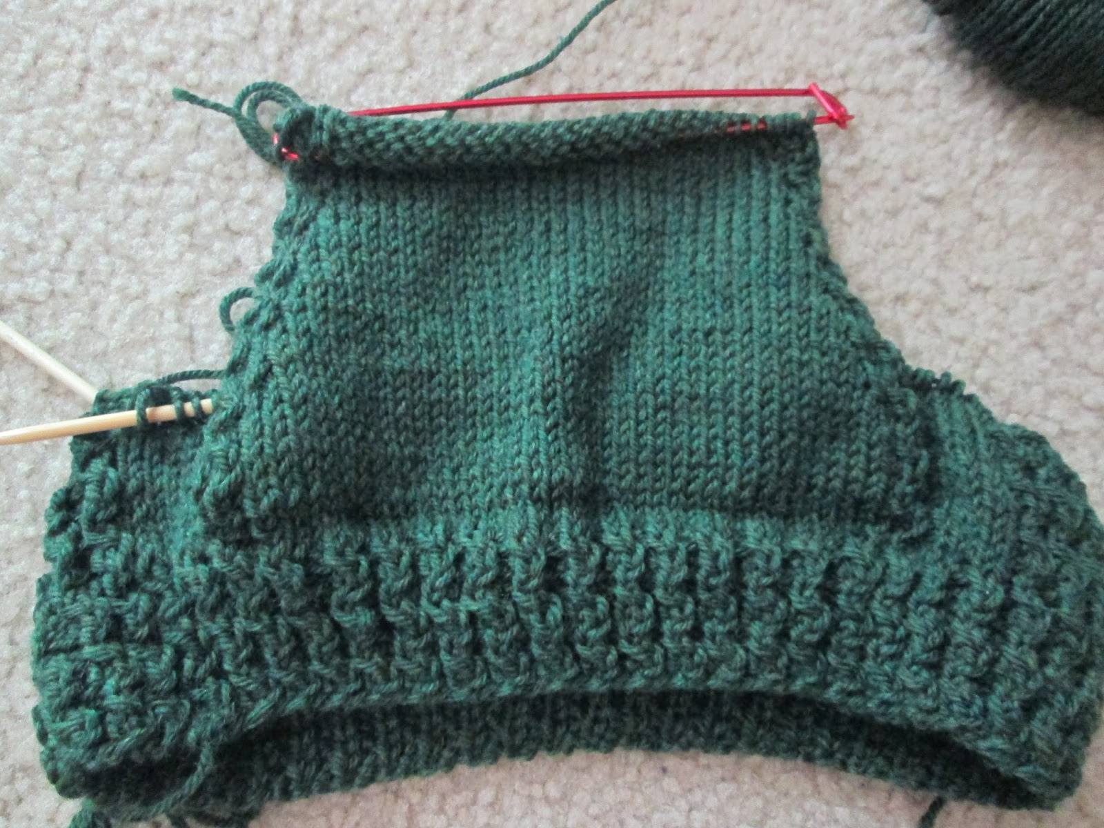 Side Squiggles sweater is coming along nicely. I attached the pocket Saturday evening thanks to the hockey game going into overtime. Yesterday I finished the body.